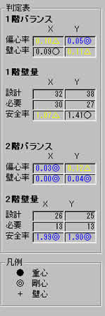 1階バランスの偏心率の表が、△・○・◎で表示されるまで、バランスよく壁補強提案をしていきます。 |